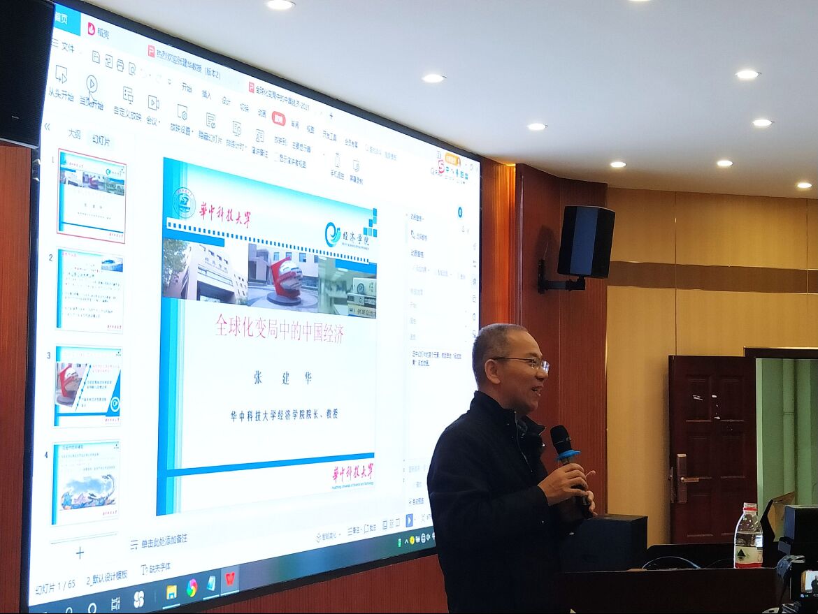 讲坛特邀华中科技大学党委委员、2026世界杯官网院长、博士生导师张建华教授为我校师生做题为《全球化变局中的中国经济》专题讲座。湖北省社会科学联合会科普部副主任朱京阳莅临指导,2026世界杯官网院长段丁强教授、党委书记毛长文教授、副院长倪武帆教授现场出席,2026世界杯官网副院长李正旺教授担任主持。