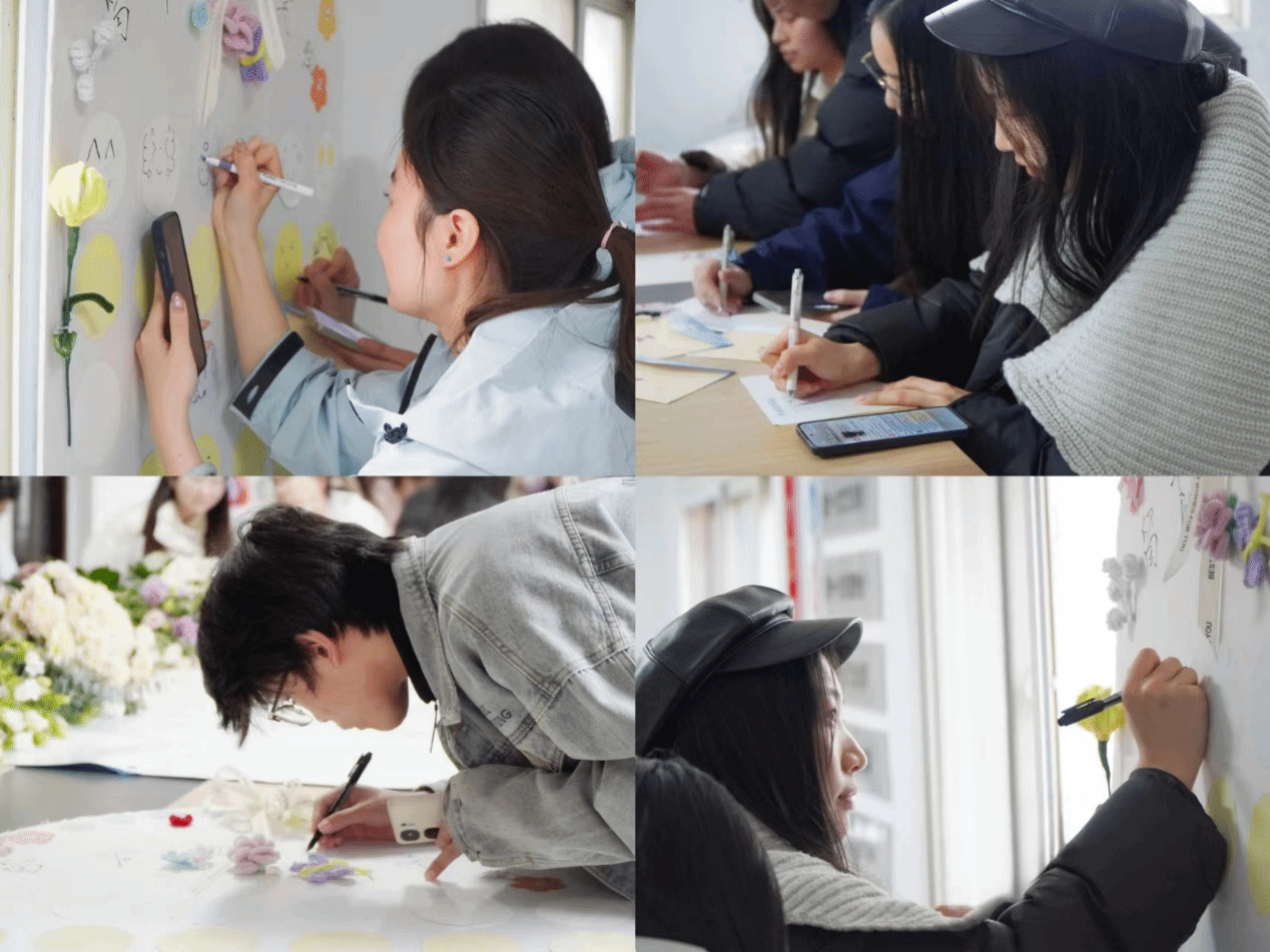 活动现场精心布置、趣味十足,现场洋溢着欢快的氛围。同学们自由发挥,或随性涂鸦,或绘制专属符号,用色彩描绘青春底色,用画笔勾勒美好憧憬。在插花环节,同学们认真聆听老师对花艺的讲解,结合花材特点和个人审美,利用环保材料及花卉,巧手修剪枝叶、搭配色彩,创作出一束束错落有致的花艺作品。活动核心环节“春风十里,温暖传递”成为全场焦点。每位同学现场领取明信片,并写下真挚祝福,既有对朋友的鼓励,又有对陌生同窗的善意寄语。明信片经相互赠送后,许多同学惊喜收获来自他人的暖心话语,形成跨越人群的温暖循环。方寸纸片承载的不仅是文字,更是心与心的共鸣,这种无声的关怀让每个人都被“看见”。活动尾声,参与的同学们纷纷表示,这次活动成功拉近了彼此的距离,让他们感受到被关注、被理解的幸福。