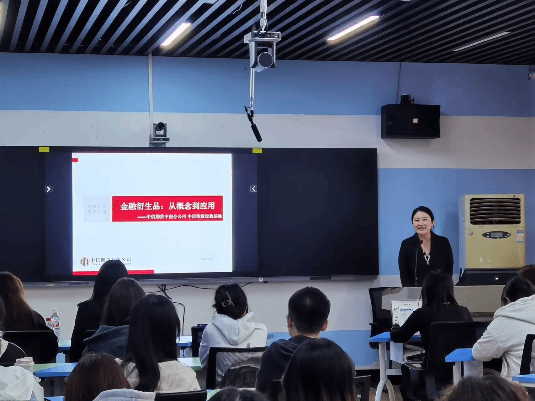 刘博洋以《金融衍生品:从概念到应用》为题,从期货基本概念出发,深入浅出地阐述了期货的特点与分类,并回顾了国际国内期货的发展历程,直观的展示了期货交易行业创新加速的趋势。她通过真实的案例和企业数据,详细介绍了期货的功能与特点,并结合图像讲解了期权的基础知识、期货期权交易市场制度及运用规则。刘博洋特别提醒同学们注意防范非法配资,避免陷入风险,并在职业规划方面详细介绍了中信期货公司的投简程序、笔试和面试环节,为学生的职业规划提供了宝贵参考。
