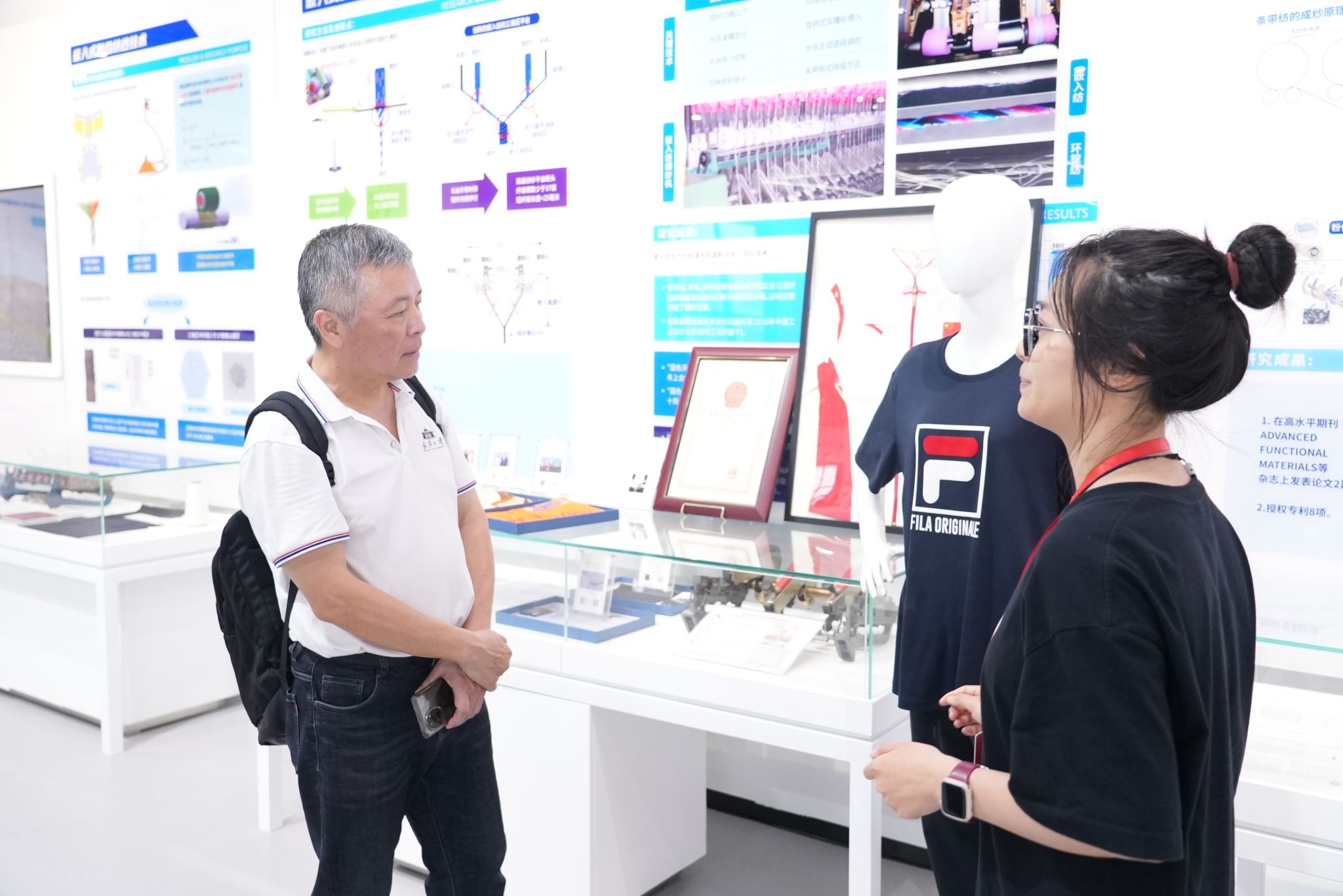 讲堂结束后,樊星参观了学校纺织科技馆,他饶有兴致地观看了馆内陈列的纺织历史文物、现代纺织工艺模型及创新成果展示,对学校在纺织领域的深厚积淀与前沿探索表示由衷的赞赏。