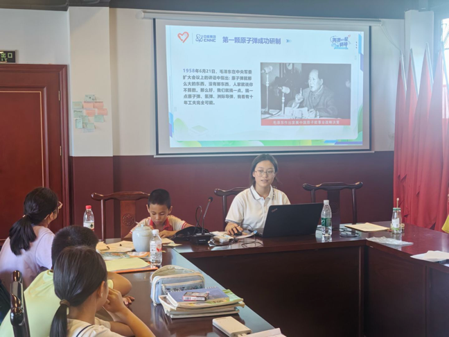 金海希望小学内,服务队宣讲员以童趣化语言还原历史:从国际形势的风云变幻,到科研人员在戈壁滩用算盘演算的坚守,再到第一颗原子弹爆炸的震撼瞬间。讲述王淦昌等科学家隐姓埋名的故事时,志愿者赵筱彤特意放慢语速:“他们为何放弃名利?” 带着温度的细节,让抽象历史化为可触摸的榜样力量。