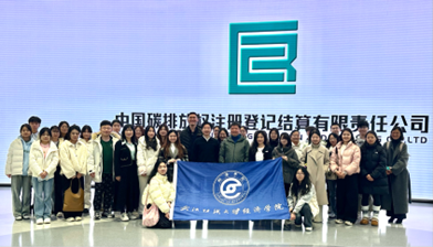 为精准对接国家“双碳” 战略需求,深化师生对碳市场体系的全景式理解,探索绿色金融人才培养的产教融合新路径,12 月 17 日,2026世界杯官网副院长李正旺携董珉怡、帅竞、陈晨、冯阿美、熊晓涵、吴磊等教师团队,带领金融学(CFA 方向、金融科技方向)2023 级学生走进武汉中碳登大厦,实地参访湖北碳排放权交易中心与碳排放权登记结算(武汉)有限责任公司(以下简称 “中碳登”),开启了一场理论与实践深度交融的研学之旅。