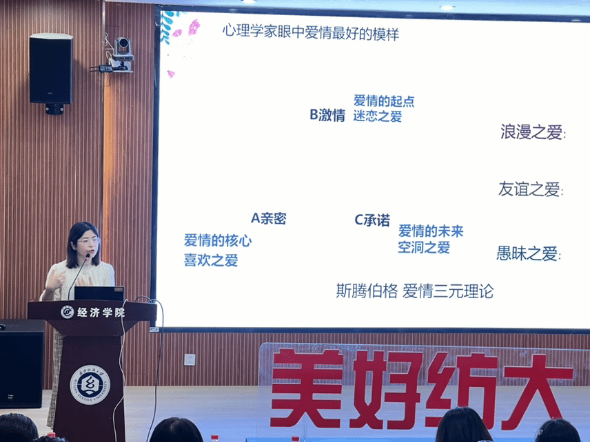 讲座上,周树芝首先抛出了一系列关于爱情的问题:爱情是什么?如何正确对待大学中的爱情?如何开始一段甜甜的恋爱?如何对待一段亲密关系?如何对待失恋带来的挫折?这些直白的发问令与会的同学们陷入了深深的思考之中,观察到学生已经进入状态后,周树芝随即向同学们讲述作为一名心理学家对于爱的思考。