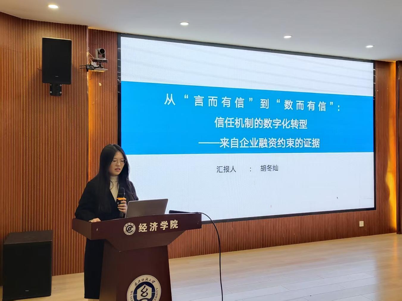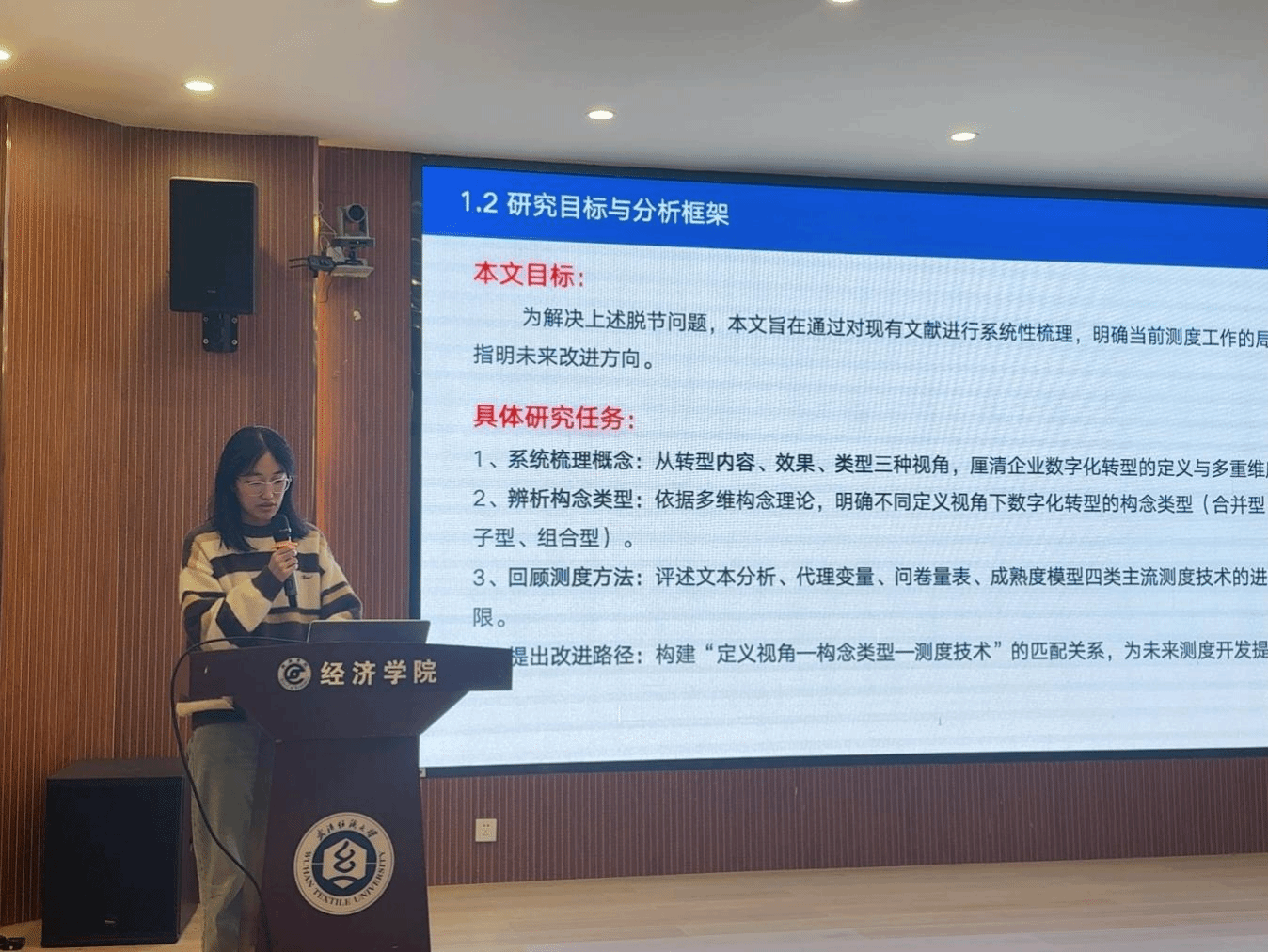 在本次论坛中,五位主讲人分别围绕其近期研究成果进行报告。吴媛媛同学以《中美印光伏产业链风险传导机制——基于动态演化博弈模型》为题,聚焦三国产业链布局差异与风险传导规律,运用动态演化博弈模型解析关键节点与演化路径,结合实证数据呈现传导逻辑与防控重点,为相关研究提供量化分析视角。邬子越同学同学以《极端市场环境下CSI300指数与能源市场多频域风险传导动态演化机制研究》为题,聚焦极端情境下两类市场风险传导的多频域特征,解析不同时间尺度下的动态演化规律结合量化模型揭示风险传导关键路径。胡东灿同学以《从“言而有信”到 “数而有信”:信任机制的数字化转型——来自企业融资约束的证据》为题,聚焦信任机制数字化转型的核心逻辑,结合企业融资约束的微观证据,剖析数字化对信任构建的赋能路径与经济效应。潘俊如同学以《企业数字化转型测度研究进展》为题,系统梳理学界主流测度方法与指标体系,对比不同方法的适用场景与优劣,剖析当前研究的热点争议与前沿方向,清晰呈现该领域研究脉络与发展趋势。刘登攀同学以《交易所财报问询函与企业投资效率:基于分析师预测的中介视角》为题,聚焦财报问询函的治理效应,以分析师预测为中介变量,剖析其对企业投资效率的影响机制与传导路径。
