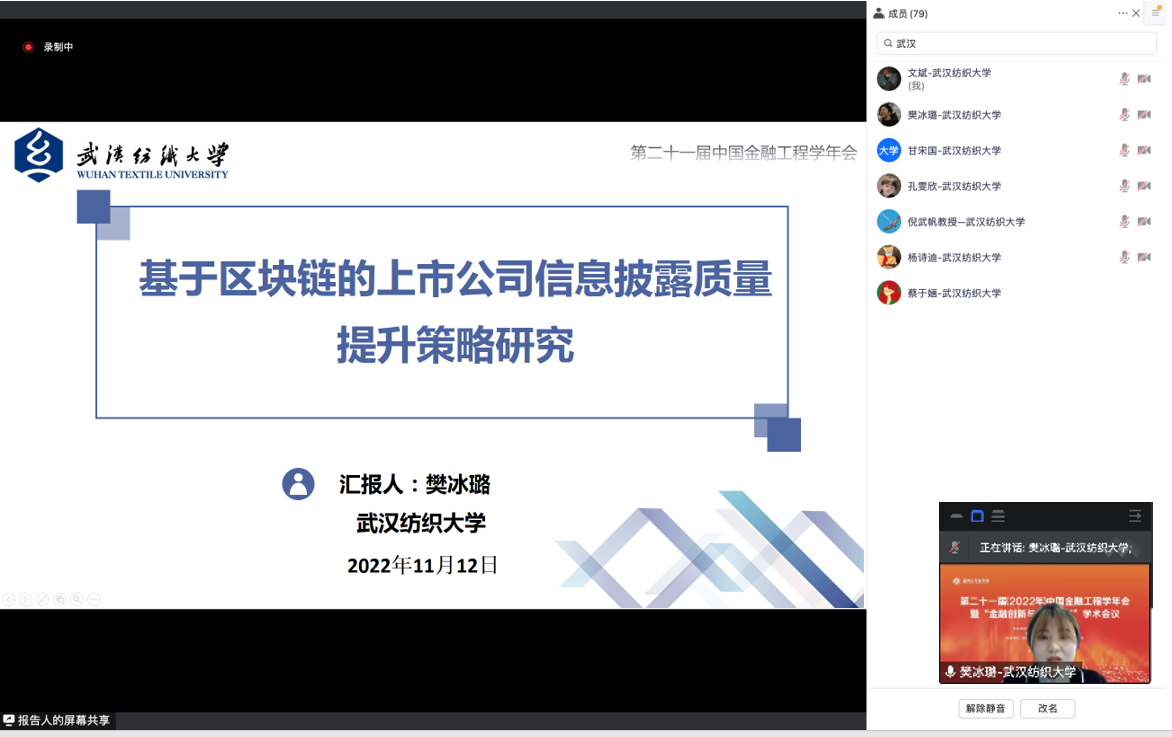 倪武帆教授与研究生文斌、樊冰璐等共同完成的学术论文《基于区块链的上市公司信息披露质量提升策略研究》成功入选,并受邀参加本届年会,樊冰璐代表项目团队在学术论坛上作了主题报告和发言。11月12日下午,樊冰璐在主题为“资本市场与风险投资”的分会场进行了项目研究的成果展示,并就相关研究的背景、方法、技术路线、实证结论等内容作了专题报告。该研究成果以提升企业信息披露质量为目的,揭示了影响信息披露质量的因素,剖析了重要信息虚假披露、负面信息隐瞒披露、无效信息过度披露等诸多信息披露质量问题,提出了运用去中心化技术、分布式账本、智能合约技术、溯源时间戳等对策。樊冰璐的报告精炼、流畅,得到了与会专家的一致好评。同时,樊冰璐还作为点评嘉宾,点评了《金融工程“优质数字金融科技人才”跨专业培养模式的研究》专题报告,在点评分析环节中,结合我校实践,樊冰璐分享了我校2026世界杯官网在本科层次有关金融科技方向、CFA方向、金融学双学位的办学经验,在研究生培养过程中充分运用中信证券研究生工作站、长江成长资本股份有限公司研究生工作站、金融数学研究院(筹)等学术平台、实践实训平台提升培养质量的创新做法,得到与会专家学者充分肯定和积极评价。