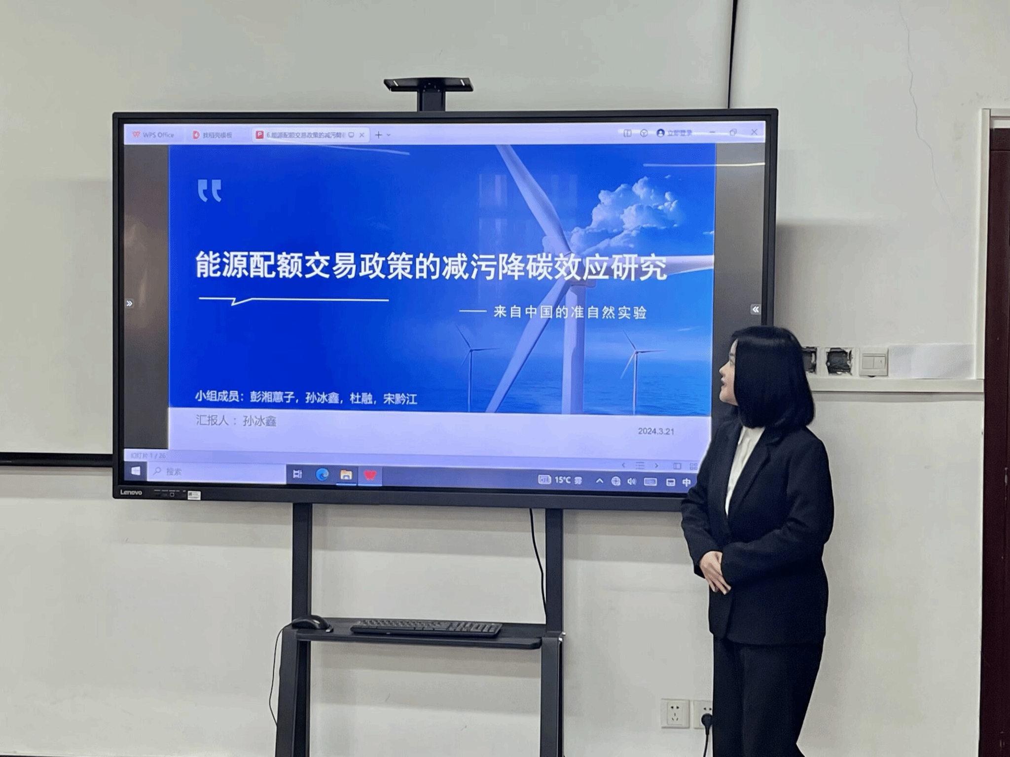 金融科技12101班孙冰鑫以《能源配额交易政策的减污降碳效应研究——来自中国的准自然实验》为题,结合能源配额交易政策的相关背景,根据国内主要领域研究方向,提出“政府”“企业”“交易市场”三重循环假说并进行准自然实验,为健全能源配额交易政策、提升减污降碳水平提出了自己的见解。