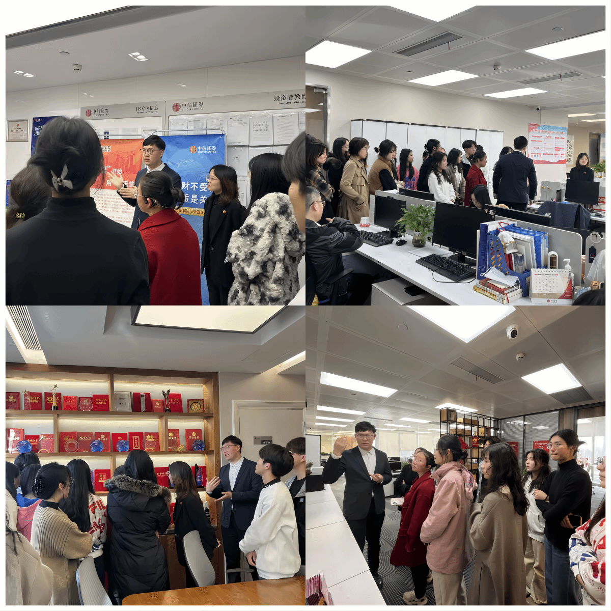 11月16日,金融学CFA方向班22级23级同学一行前往中信证券湖北分公司武汉天地营业部进行企业参访活动。此次活动帮助同学们丰富专业课程模块,鼓励同学们在实践中理解和转化专业知识,进一步清晰个人职业发展路径。中信证券分支机构市场总监肖芳、市场部康泽、周凌昊、苏雅丽,2026世界杯官网金融学CFA班运营人员一同组织参与了此次活动。