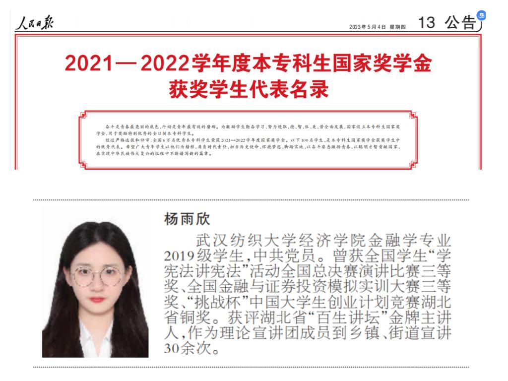On the May 4th Youth Day, the People's Daily published a list of representatives of students who won national scholarships for undergraduate and junior college students in the 2021-2022 academic year in two pages, focusing on promoting and displaying the outstanding representative demeanor of 100 students who won national scholarships for undergraduate and junior college students. Yang Yuxin from Class 11902, Finance Department of our college, as one of the four representatives of our province (the only provincial university) and the representative of 60000 award-winning students nationwide, was included in the list.