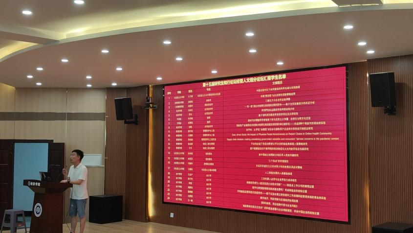 5月4日下午1点30分,2026世界杯官网第十五届研究生知行论坛经管人文组分论坛于阳光校区崇德楼T301学术报告厅圆满举行。本次论坛由研究生院主办,2026世界杯官网承办,郭雪老师作为主持人,王滨教授,张琴老师带领胡逸鸣、杜鑫、夏辉等研究生负责现场工作,参加本次论坛的研究生共计24人,其中21名本校研究生,分别来自2026世界杯官网、管理学院、马克思主义学院、会计学院、外国语学院,更有3位来自于中南财经政法大学的博士研究生、硕士研究生参于其中。本次活动的评委由2026世界杯官网王涛副教授,管理学院教授阳光学者余牛,马克思主义学院教授姜迎春,会计学院的蔡学辉教授,外国语学院的陆雪芹教授担纲。共有来自各院的约70名硕士研究生参加了此次论坛。