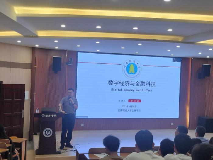 为营造浓厚学术氛围,开拓我院师生研究思路与学术视野,2023年5月28日晚上19时,由学院承办的阳光论坛第393期暨经世讲堂第28期于阳光校区崇德楼07-T301阶梯教室顺利举行。云南财经大学金融学院副院长、博士生导师、教授李江城特邀作“数字经济与金融科技”专题讲座。金融专硕中心主任王涛副教授、学院科研骨干教师以及研究生、本科生参加了论坛,论坛由副院长王滨教授主持。
