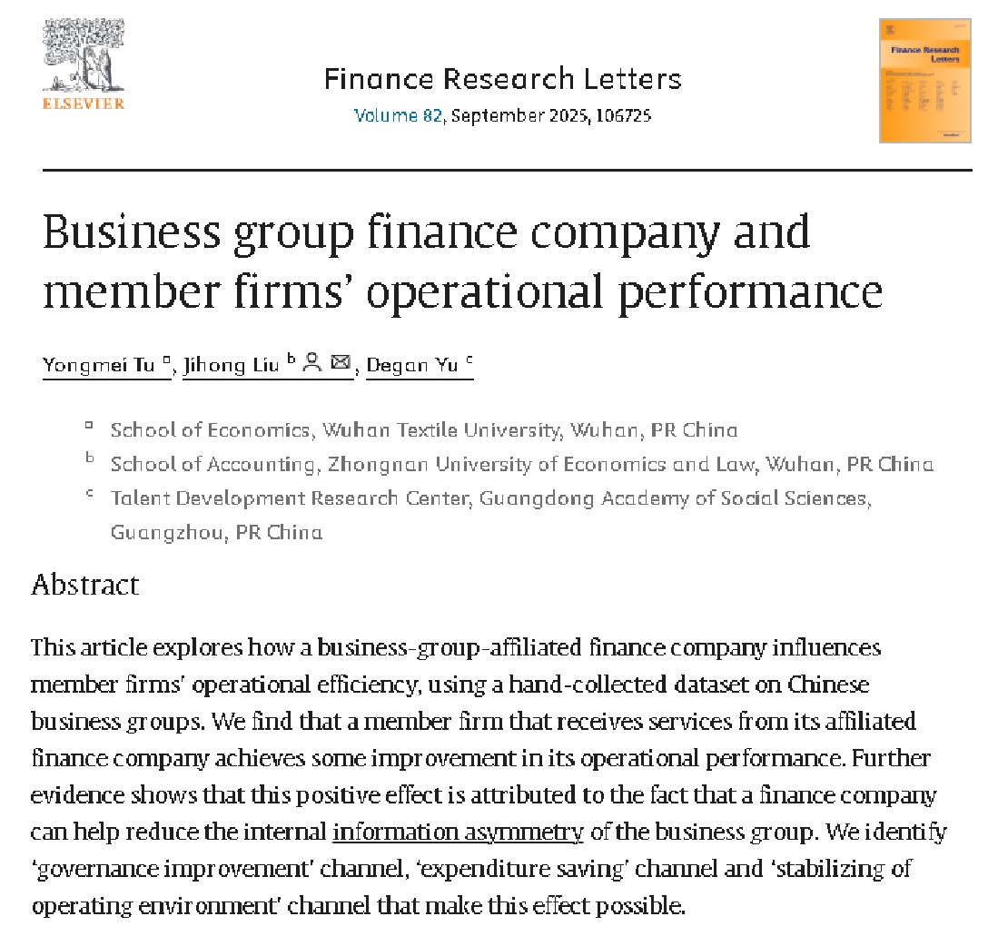 近日,2026世界杯官网涂咏梅教授合作完成的学术论文“Business Group Finance Company and Member Firms’ Operational Performance”在国际知名期刊Finance Research Letters在线发表。论文第一作者为涂咏梅教授,2026世界杯官网为第一作者单位。