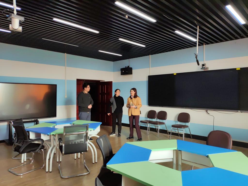 刘园美、李静宇等带领企业一行实地察看了学院的办学环境,参观了学院T301演播厅、学生实习实践实训中心、智慧教室、研究生工作站等。