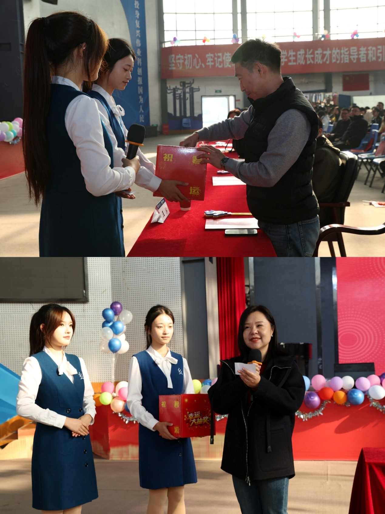 第一篇章 “荧屏启光,新篇序章始”,以热烈奔放的氛围点燃全场。校操舞队带来的爵士啦啦操《Beat Heat》活力四射,动感的节奏、整齐的动作瞬间引爆现场热情;校文化艺术中心声乐部演唱的《我是如此相信》,歌声悠扬婉转、饱含深情,传递出青年一代坚定信念、勇毅前行的力量;税收 12302 班、财政 12302 班学子联袂呈现的合唱《我爱你中国》,旋律激昂、情感真挚,满腔的爱国情怀引发全场师生强烈共鸣,现场掌声雷动。随后,张莎莎和王滨为本科生导师颁发聘书,见证师生携手共进的美好时刻;两位老师一同开启首轮幸运抽奖,欢声笑语弥漫整个演播厅。