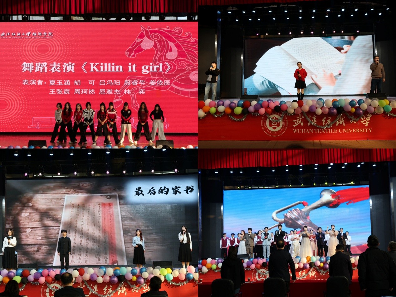 第四篇章 “远帆凌风,山海向明朝”,寄托美好愿景与奋进决心。赵当如、李超帅、陈美茜三位老师联袂演唱的《同桌的你》,旋律悠扬怀旧、歌声温柔治愈,勾起了在场师生对校园青春岁月的温馨回忆,满是温情与感动;朗诵《最后的家书》深沉有力、感人至深,演员们以真挚的情感、精湛的演绎,传递出革命先辈的家国大义与赤子情怀,让现场观众深受触动;夏玉涵、胡可等人表演的舞蹈《Killin it girl》活力四射、气场全开,利落的舞姿、自信的笑容展现了新时代青年的蓬勃朝气与青春风采;最后,全体师生起立齐声高唱《我们走在大路上》,激昂的旋律、嘹亮的歌声响彻演播厅,将晚会气氛推向最高潮,唱出了经院人同心同德、砥砺前行、共创未来的坚定信念与豪情壮志。活动在全体师生温馨地合影留念中圆满落下帷幕。