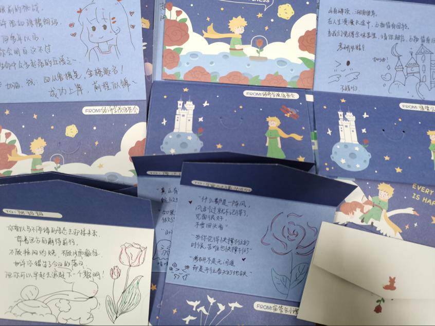 活动开始前,宿管会成员和志愿者们亲笔书写一张又一张明信片,他们每个人的脸上都充满对学长学姐的祝愿与期望。或是一句句温暖的“前程似锦”,或是一幅幅可爱的简笔画,明信片中的每一个细节无不体现着学弟学妹们对考研学子的真挚情感。一位宿管会干事说:“我曾不止一次看见有备考的学长学姐在早晨六点半之前就步履匆匆地赶往图书馆,真希望他们能得偿所愿,考得心仪的分数。”春夏秋冬时长漫漫,晨昏破晓分分秒秒,希望来自学弟学妹们的暖心祝福,能够在他们孤苦的考研路上温情护航。