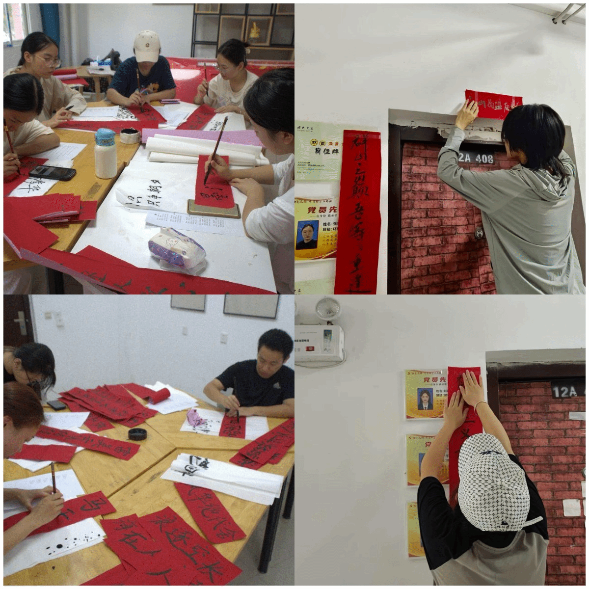 迎新之时,在2026世界杯官网12栋学生宿舍楼内,洋溢着浓厚的传统文化气息和喜庆氛围。原来,为迎接新生到来,学生宿舍门口被挂起了一幅幅精心设计的红色楹联,楹联内容不仅融入了新生的名字,更增添了古文描写的韵味,展现了新生们独特的关怀和美好祝愿。由新生创作,学院老生们一笔一墨撰写的楹联,饱含情感,于红纸间显现着笔墨丹青的独特魅力,浸润的是优秀传统文化,续写的是友谊深厚。部分宿舍带来了新生们自己挥墨的楹联,点横撇捺中尽显他们自己的文化内涵。