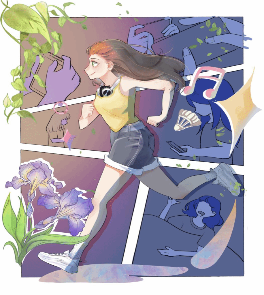 “脆皮大学生”、“熬夜搭子”、“清澈愚蠢”这些流行词语的出现完美地诠释了当代大学生的生活现状:运动量少,晚上熬夜白天在寝室睡一天,饿了就点外卖,绝不出宿舍半步。可作为年轻人,年轻才是资本,应该趁着年轻多看看外面的世界,于是作者引用了网上一句很流行的话语“勇敢的人先享受世界”创作了这幅插画。画中一位朝着光的方向奔跑的女生,脚下踏出了七彩的光斑,鸢尾花象征着自由和勇气,高处的绿萝象征着善良和坚韧,这些元素的寓意是少年向着阳光奔跑,脚下留下的是七彩的花路。与此进行对比的是正在玩手机和睡懒觉的背景人物,更加突出主题。