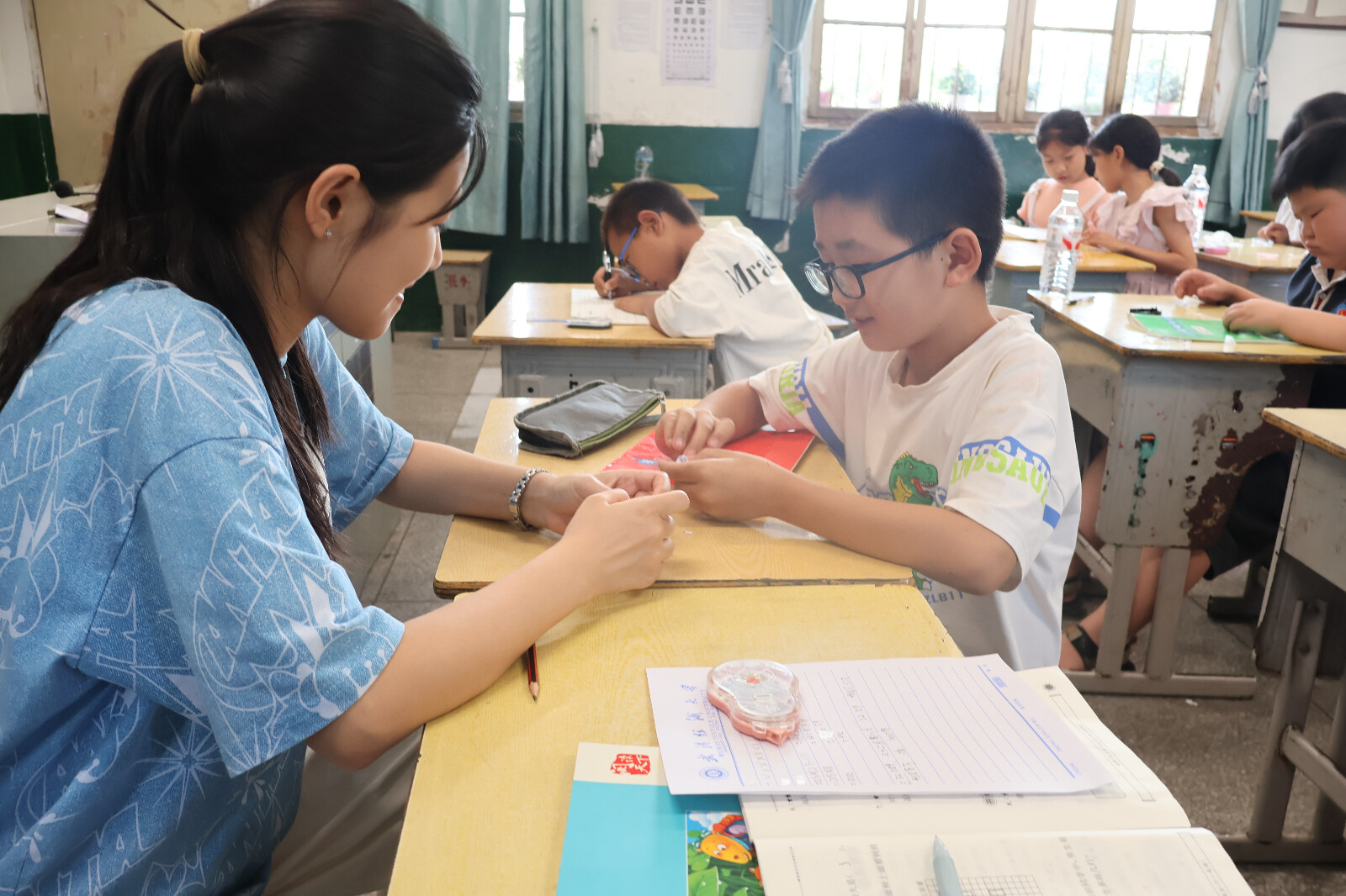 稍作休整后,队员们迅速投身工作,分别前往金海希望小学、斗山村、涂山镇进行教学。队员们以生动有趣的方式自我介绍,分享自身专长与对支教的期待,瞬间点燃了孩子们的热情。为增进彼此的感情,营造活跃的学习氛围,队员们精心筹备了趣味游戏环节。“自画像”活动让孩子们充分发挥想象力,用五彩画笔勾勒出心中的自己。在金海希望小学,“看图猜成语”游戏让现场热闹非凡,孩子们踊跃抢答,积极展现知识储备,稚嫩的声音此起彼伏。斗山村的课堂上, “找不同”深受孩子们喜爱。大家全神贯注紧盯图片,仔细寻找每一处差异。涂山镇教学点巧用“击鼓传花”,鼓励拿到“花”的小朋友大方上前,表演节目,活动气氛热烈,笑声不断。在游戏过程中,支教队员巧妙融入安全知识普及,结合游戏画面讲解交通安全、防溺水等知识,让安全教育变得生动有趣。