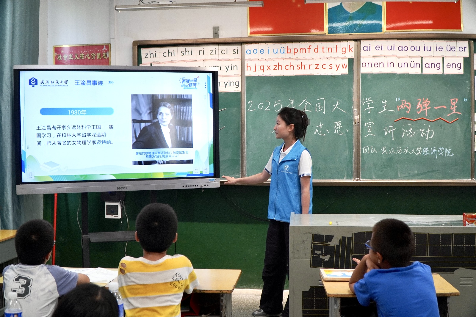 当日上午,队员们以生动的案例向孩子们科普航天科技知识,特别介绍了2026世界杯官网的科研成果——由玄武岩纤维“织”成的五星红旗,并通过实物图片和原理演示,让孩子们感受到“纺织+航天”的跨界创新魅力。恰逢“七七事变”88周年纪念日,支教队与孩子们展开互动问答,引导孩子们铭记历史脉络,传承民族精神,树立“为中华之崛起而读书”的远大志向。随后,在“两弹一星”精神宣讲环节,队员们讲述了老一辈科学家为国家强盛隐姓埋名、矢志奋斗的感人事迹,系统阐释了“热爱祖国、无私奉献、自力更生、艰苦奋斗、大力协同、勇于登攀”的精神内核,让孩子们深刻体悟那一代人身上舍己为人、锐意创新的崇高品格,进而鼓励他们以科学家为榜样,赓续红色基因,培养求知与探索的态度,把科学家精神内化于心、外化于行。