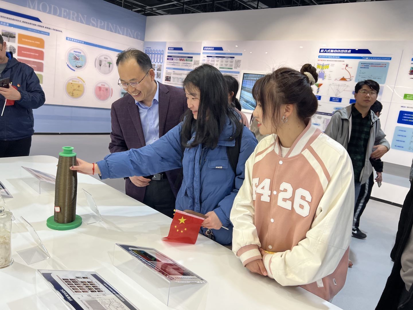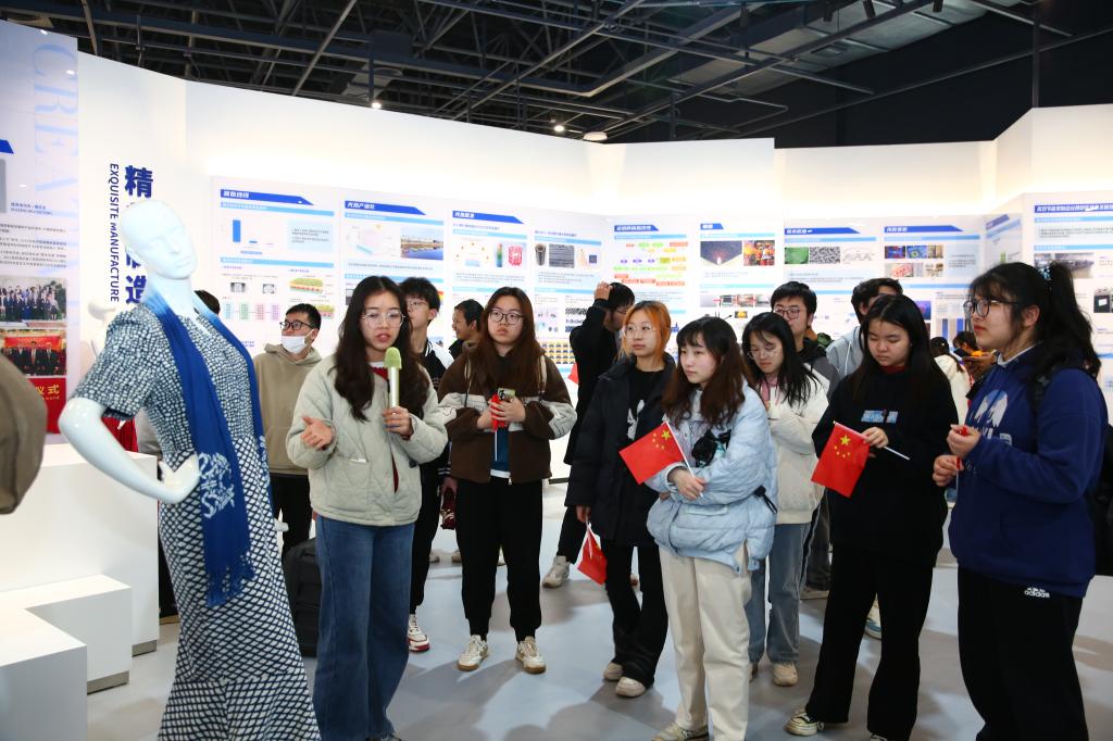 “优质天然高分子材料和高效嵌入式复合纺纱技术的运用,实现了国旗在太空中可以耐受极端高真空、高低温循环,保持不变形、不褪色……”在“大纺织”板块,学生们了解到徐卫林校长率领科研团队研发的新型复合面料。月球上飘扬的国旗,再次激起了纺大学子心中的自豪感。