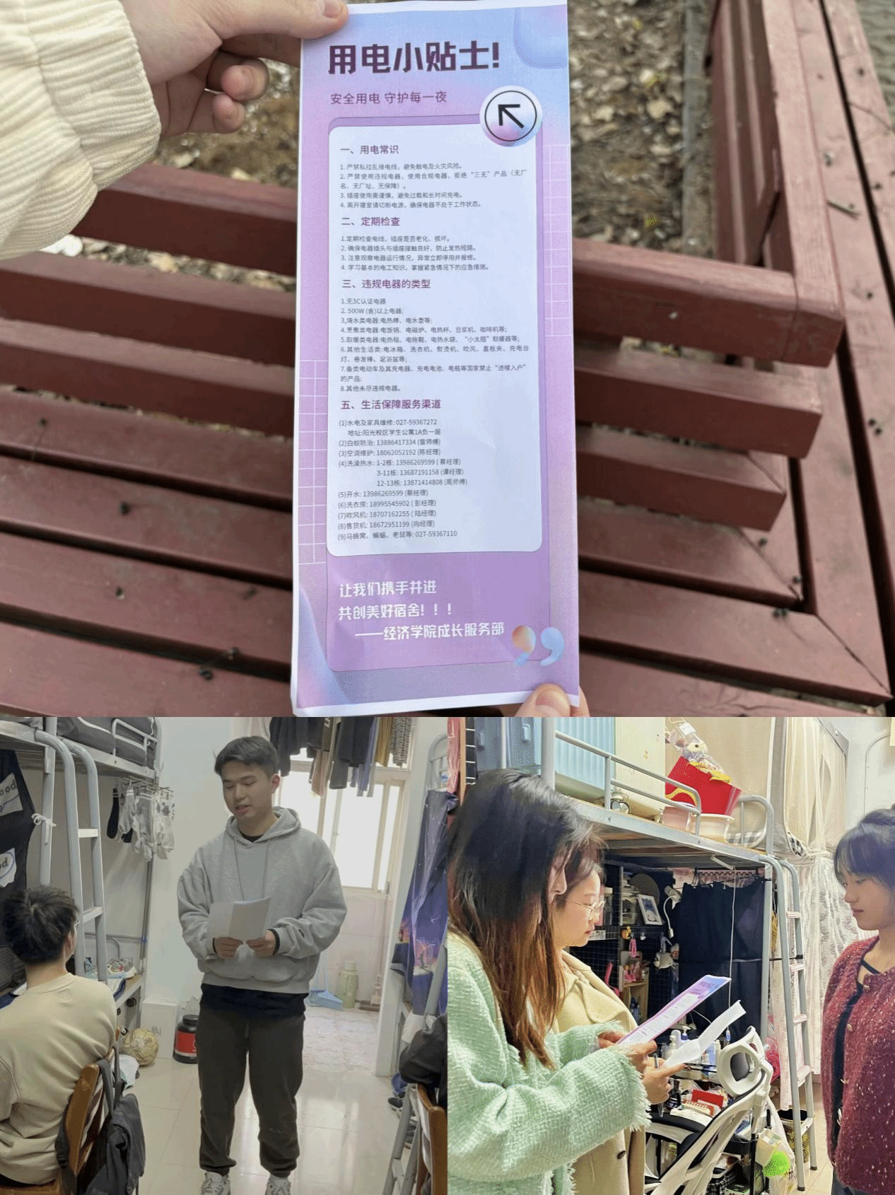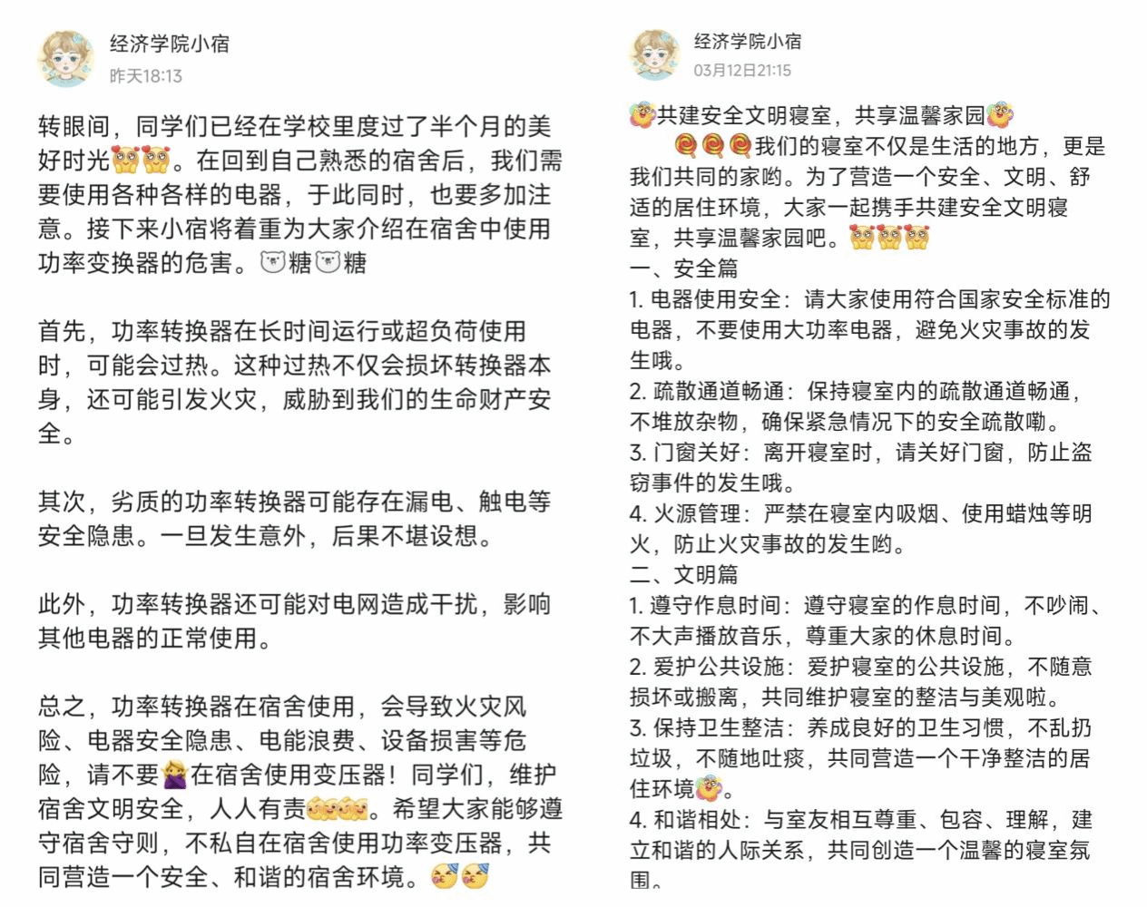 此外,成长服务部还充分利用小宿官Q等社交媒体平台,多次向学生们推送寝室违规电器科普小贴士。这些小贴士内容丰富、形式活泼,旨在鼓励全体学生积极参与宿舍文明建设,共同为打造一个文明、安全、和谐的宿舍环境贡献力量。