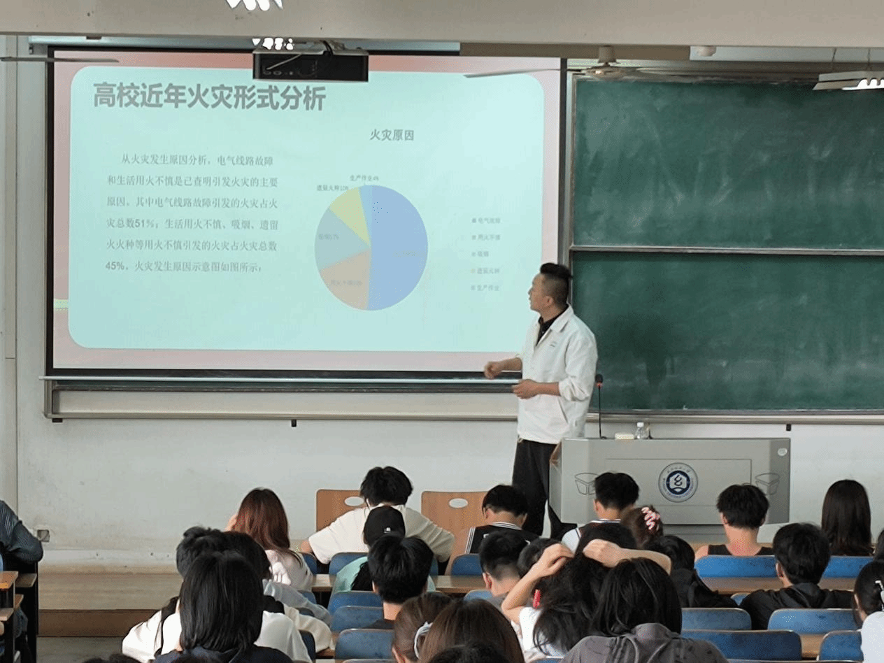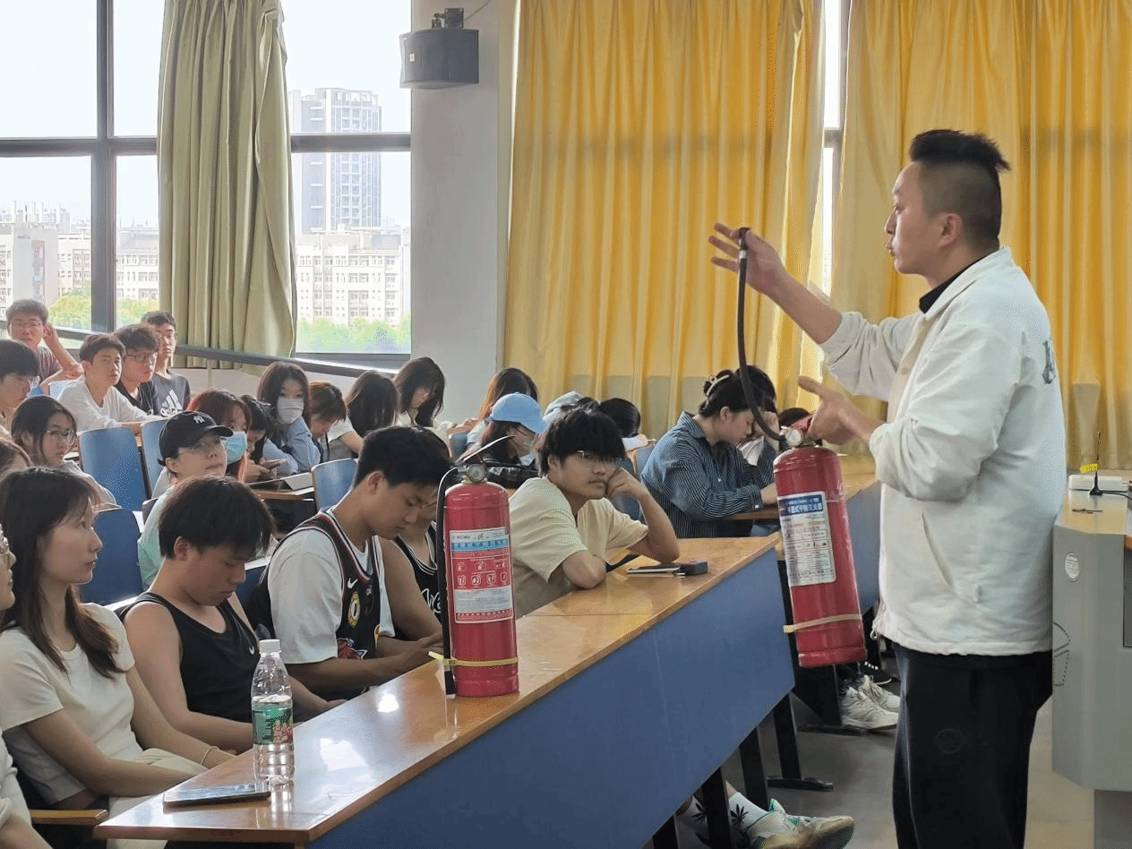 陈斌从消防器材入手,将灭火器带进课堂,详细介绍了灭火器的种类和使用方法,并指导同学们进行灭火器实操练习,课堂上氛围活跃。针对近年来的校园火灾实际案例,陈斌进行了剖析,将火灾特点、火灾发展规律、燃烧条件等专业知识进行了梳理,并分别从消防法有关规定、火灾常识、发生火灾后的应急措施等方面向同学们详细介绍了校园消防安全知识,与在场同学共同探讨。