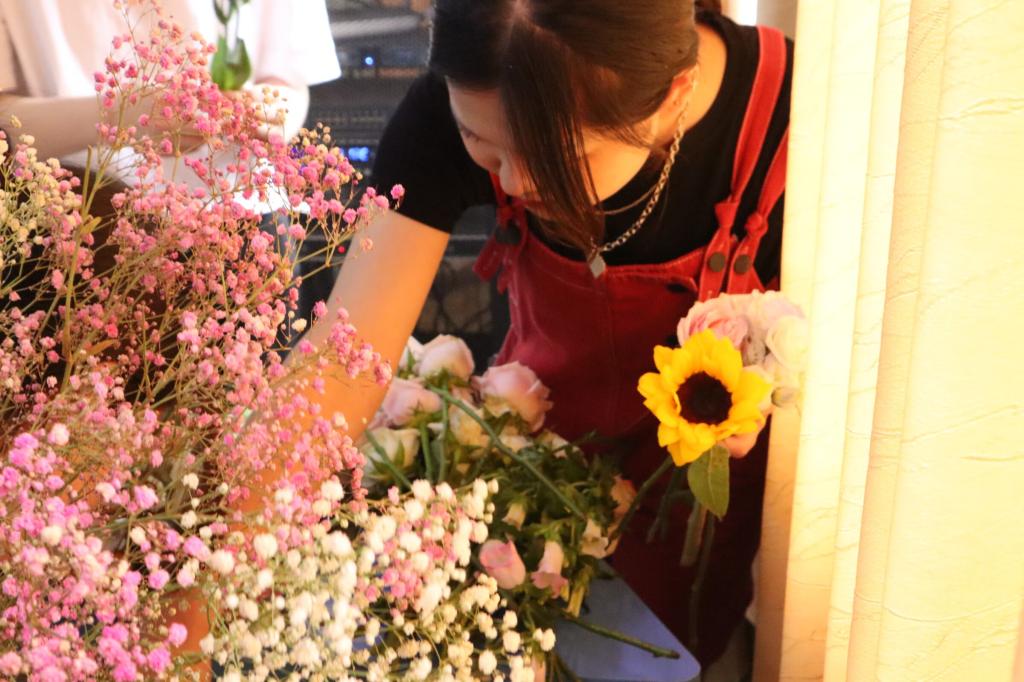 活动采用理论与实践相结合的方式,现场从插花艺术的美学原理、花卉养护基本知识、不同花卉代表的寓意三个方面,对花艺进行了系统的讲解,围绕选取插花材料、方法技巧、造型样式与色彩搭配等内容,现场进行了插花技巧演示。学生结合花材特点,根据个人审美,运用提供的废旧塑料瓶或纸杯等环保材料及花卉,亲手制作出自己的花卉艺术作品,得到了现场专业花艺老师的赞许与认可。