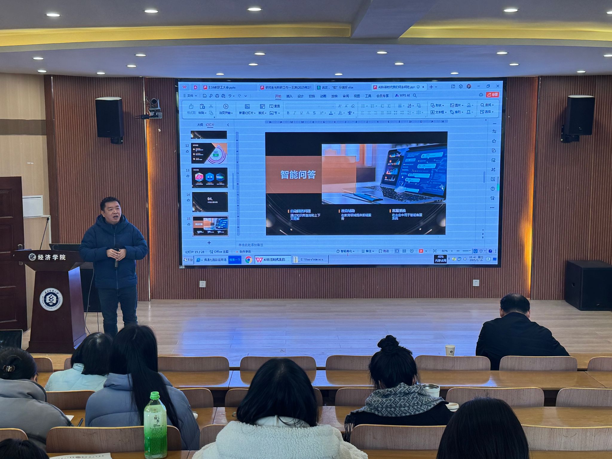 副院长李正旺、王滨、工会主席朱云峰分别对教学、科研、工会工作进行了详细安排。会上,李正旺开展了AI专题科普,要求广大教职工主动适应形势,深入理解人工智能的基本原理、应用场景及其对教育领域的影响,积极探索AI技术与教育教学的融合路径,提升数字化素养,为培养未来创新型人才奠定基础。