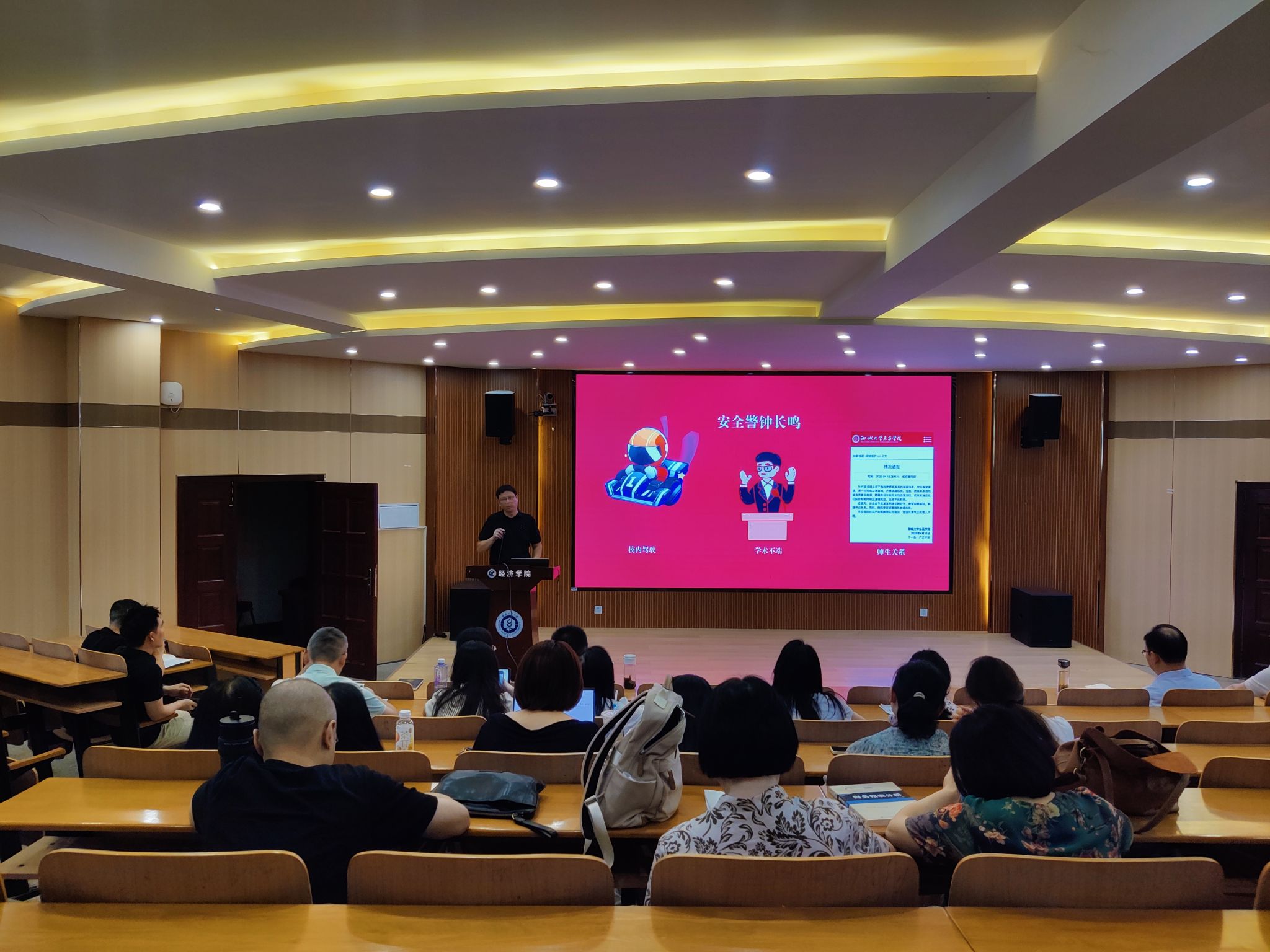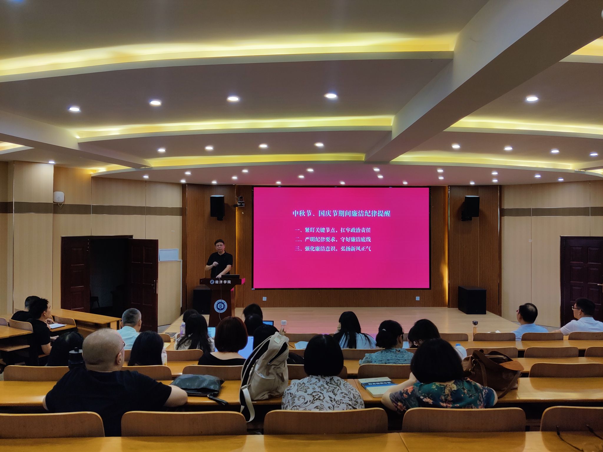 临近中秋、国庆双节,刘园美特别开展廉洁纪律提醒,要求全体教职工严格遵守廉洁自律各项规定,杜绝节日期间违规违纪行为,营造清廉过节的良好氛围。同时,他代表学院向全体教职工致以节日问候,提前预祝大家在第41个教师节到来之际节日快乐,鼓励大家以饱满的热情投入新学期工作。