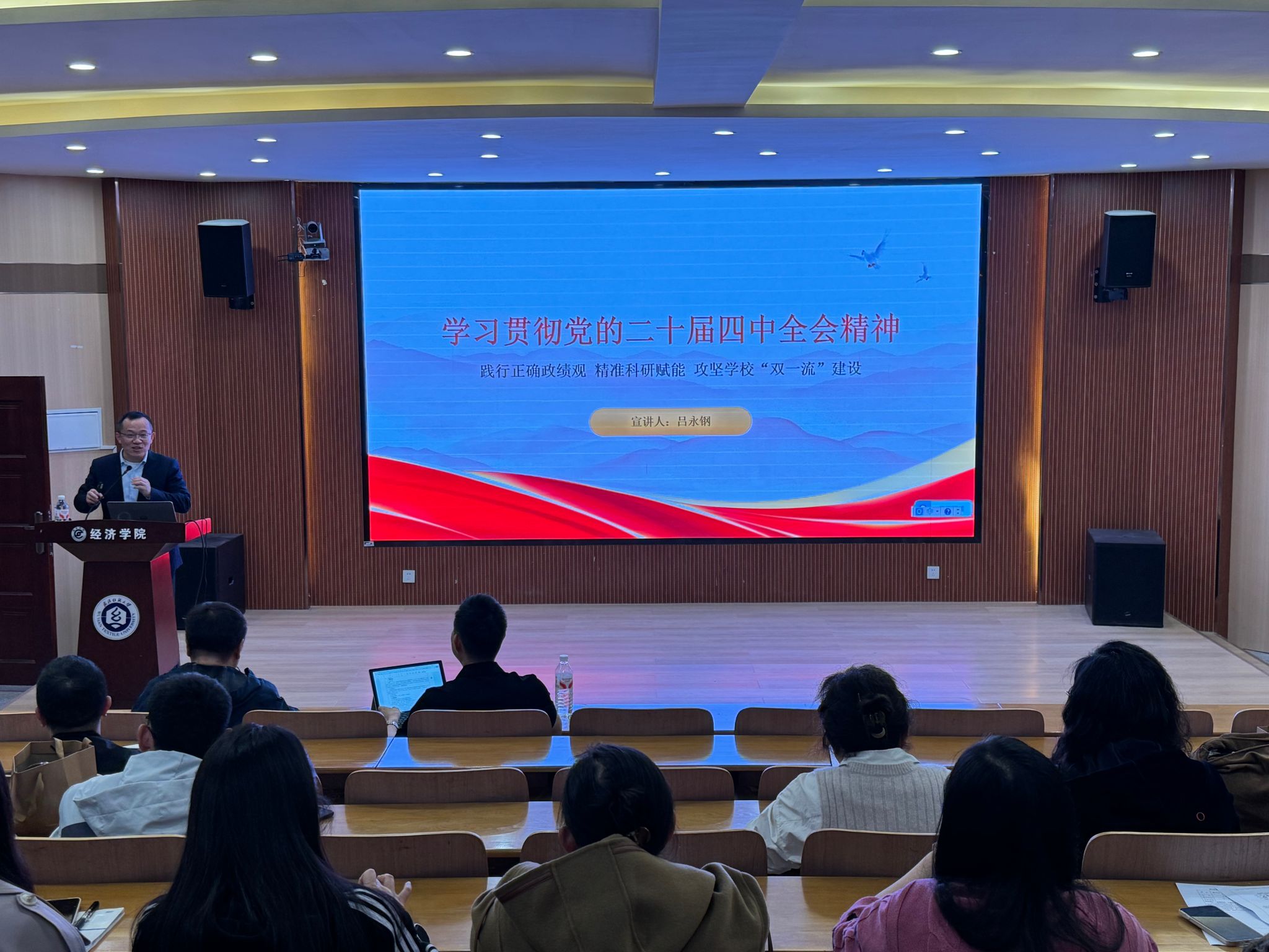 吕永钢以践行正确政绩观、精准科研赋能、攻坚学校“双一流”建设为主线,系统解读党的二十届四中全会核心要义,紧密结合学校科技工作、经济学科特色与“十五五”科研规划,为全院教职工上了一堂靶向鲜明、务实深入的辅导报告。他指出,党的二十届四中全会是我国迈向基本实现社会主义现代化关键时期召开的里程碑式会议,全会审议通过的《中共中央关于制定国民经济和社会发展第十五个五年规划的建议》,为高校科研指明方向、划定坐标。