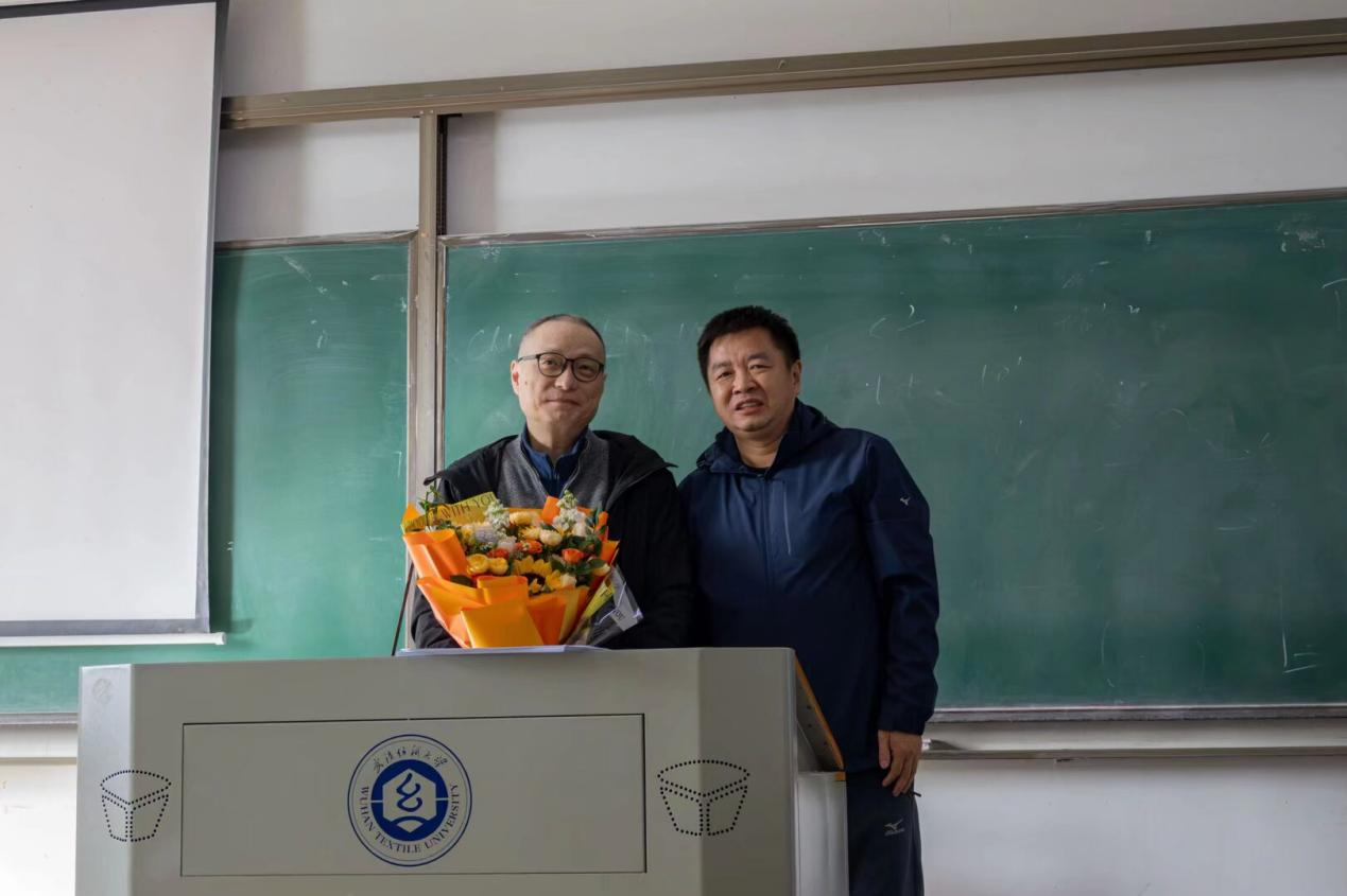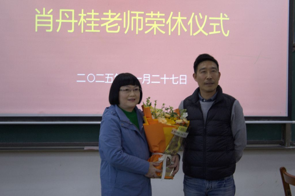 在肖丹桂老师的最后一堂课现场,同样的惊喜温暖上演。王滨副院长代表学院致辞,向执教37年的肖丹桂教授致以由衷的敬佩。“这堂陪伴同学们的最后一课,也是您数十年教学生涯的生动缩影。”王院长回顾了肖丹桂老师在教学科研、人才培养等方面作出的突出贡献,充分肯定了其严谨治学的态度与无私奉献的精神,话音刚落,现场便响起热烈的掌声,肖老师频频点头,眼中泛起感动的泪光。随后,学院代表为肖丹桂老师献上鲜花,全体同学齐声合唱《追光者》,悠扬的旋律传递着对恩师的不舍与祝福,不少同学和老师都为之动容,现场氛围温馨感人。