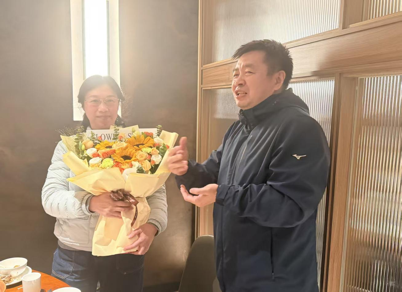 金敏老师也收到了来自学院工会活动上学院的祝福。李正旺副院长带领师生代表送上荣休祝福,突如其来的仪式让金老师倍感惊喜与温暖。李正旺深情追忆了金敏数十载扎根教坛、潜心育人的奉献历程,高度赞扬其严谨务实的治学作风、甘为人梯的育人精神以及对学院学科建设与人才培养的重要贡献,并代表学院及全体同事祝愿金敏老师退休生活幸福美满、诸事顺遂。